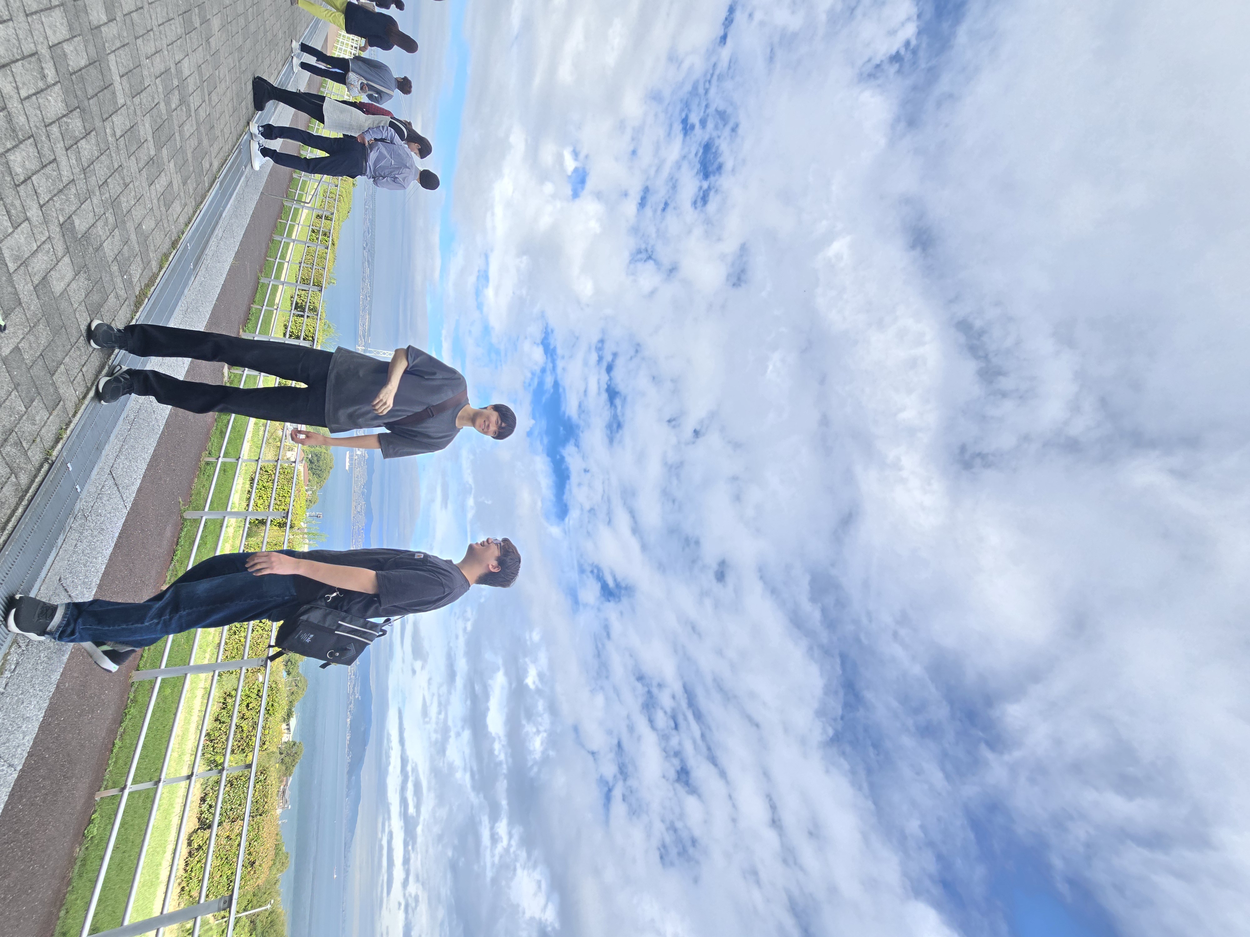 次に向かったのは明石海峡大橋のサービスエリア。企画目線だとここは宿泊場所のチェックインまでの時間を潰すために入れました。でもホームページ用の集合写真も撮れたし、淡路島らしいご飯も食べれたし結果的に大正解な場所でした。ここでのベストショットはM2森川さんとB4柴谷くんの2ショット!!「映えるにはカメラを広角にして下から撮る」って最近X(Twitter)で言われてますよね。写真は実践したらつまようじみたいになった二人です。